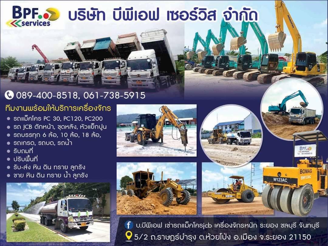 ต้องการเช่า ใช้เครื่องจักรกลก่อสร้าง ติดต่อ B P F services บริการให้เช่าเครื่องจักรกลหนักระยอง เช่าเครื่องจักรก่อสร้าง แบบรายวัน รายเดือน หรือสัญญาจ้างระยะยาวให้ราคาถูกมาก รับงานโรงงานและงานราชการ 089-400-8518